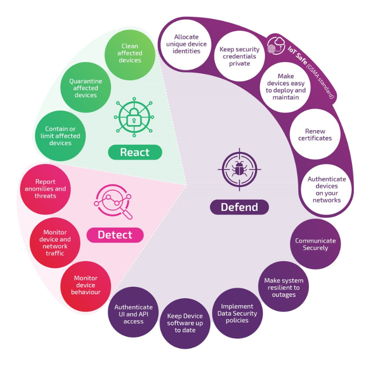 Defending means managing the cyberattack surface to prevent unauthorised access of devices, cloud infrastructure and data. Practically, this encompasses IoT SAFE (a SIM standard to authenticate and authorise IoT devices to mobile networks), cloud authentication, software updates, encrypted communications and secure APNs.